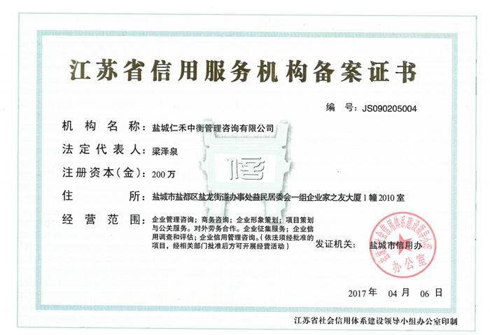 - 江蘇省信用服務機構備案證書